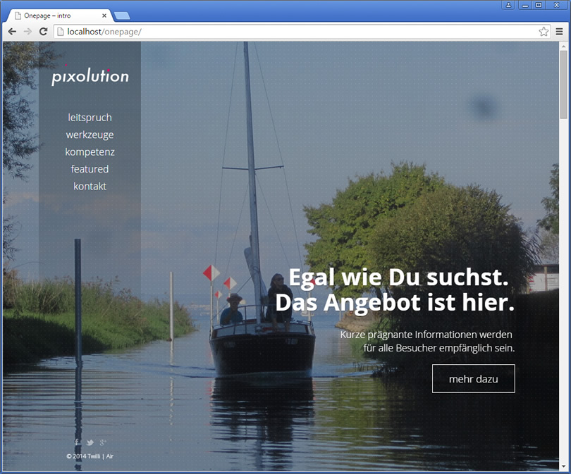 www.pixolution.ch, Content Management realisiert mit CMSimple_XH, Responsive Layout realisiert mit Bootstrap und adaptiertem Twilli Air Template. Features: Onepage Design, Ajax Webform, Owl Carousel Image Gallery.